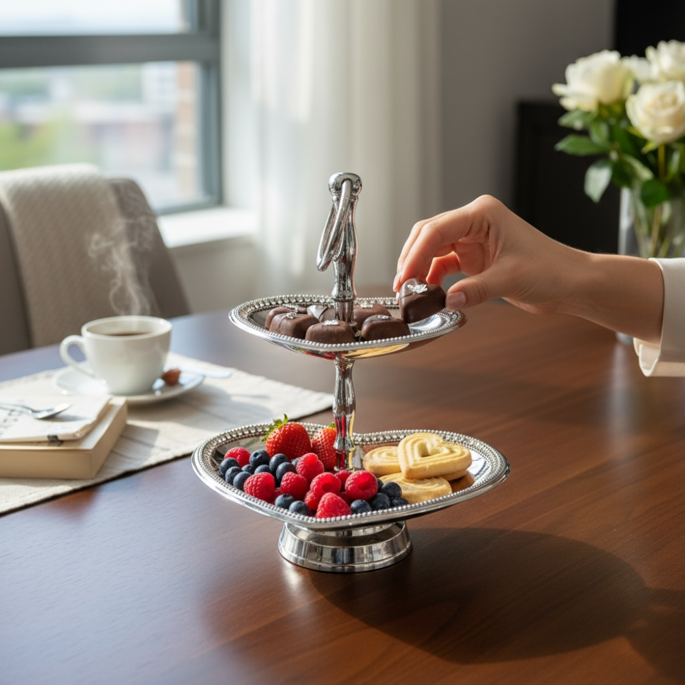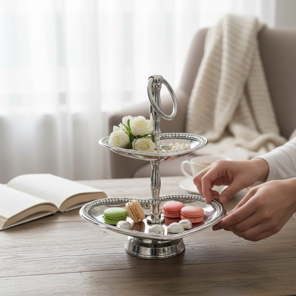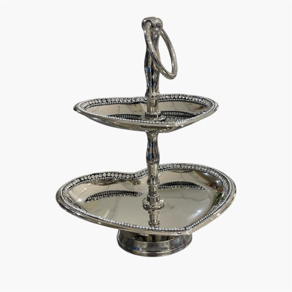 ستاند حلا فضي بتصميم أنيق يجمع بين الفخامة والعملية، مصنوع من الاستانلس استيل عالي الجودة بلمعان راقٍ ولمسات متقنة. يأتي بدورين لزيادة مساحة التقديم، مع أطراف مزينة بالكريستال الفاخر التي تضيف لمسة من الأناقة والرقي، مما يجعله مثاليًا لتقديم الضيافة بأسلوب جذاب.