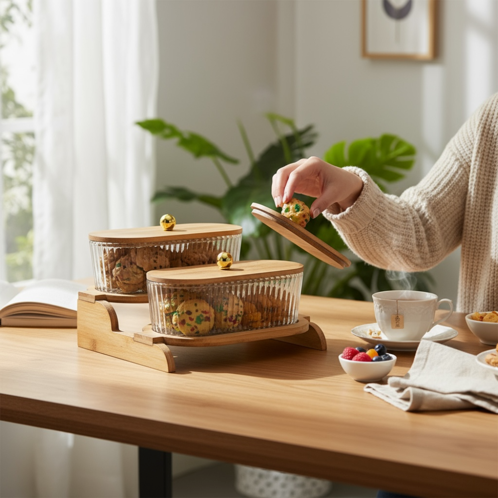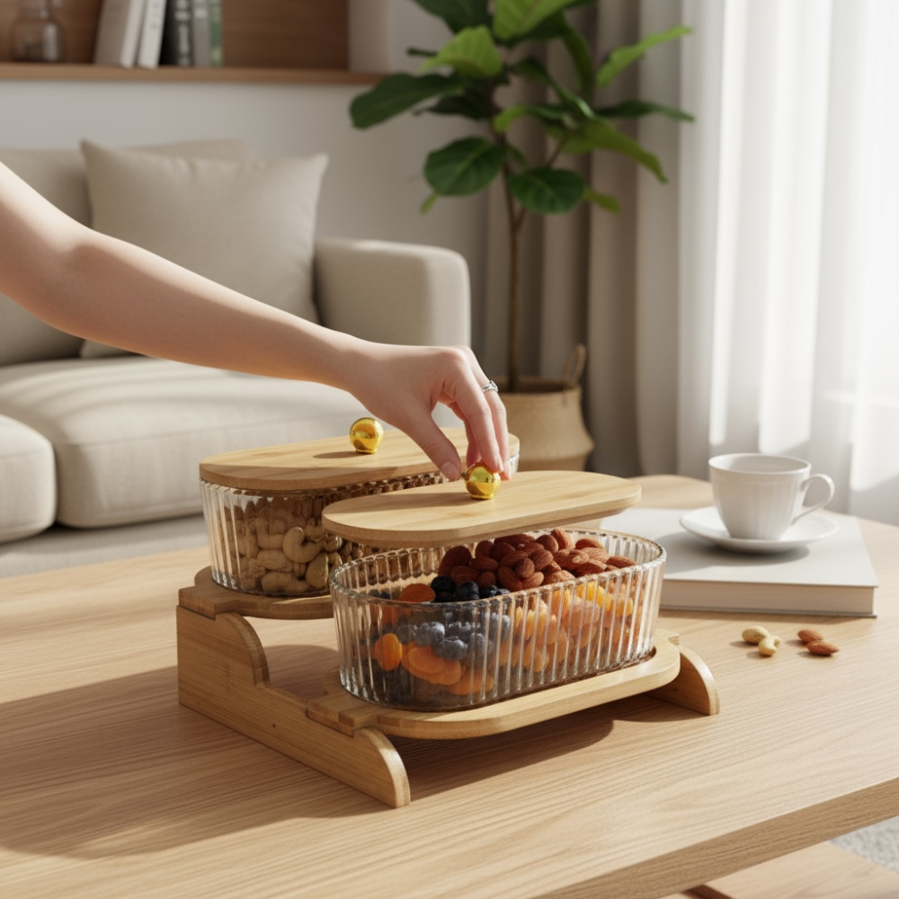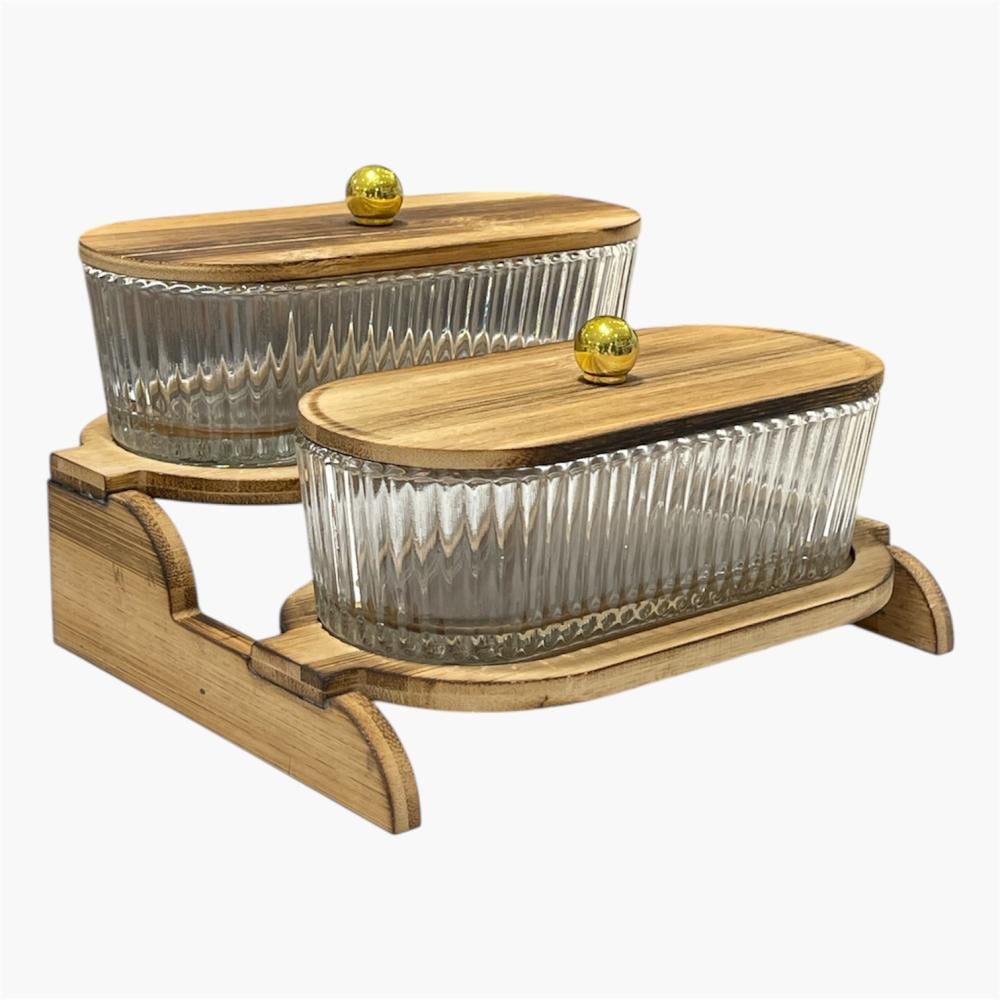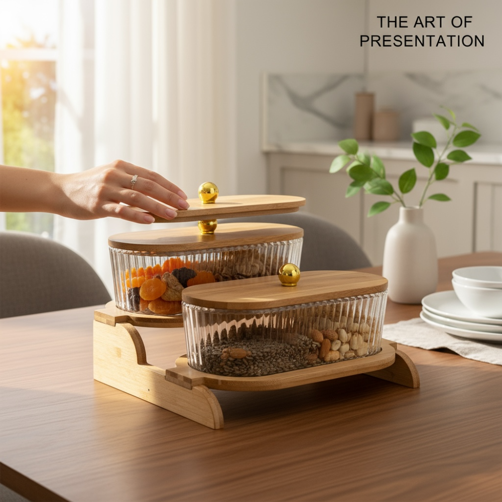 تقديمية أنيقة تجمع بين الزجاج والخشب بتصميم عصري يضفي لمسة فاخرة على الطاولة.