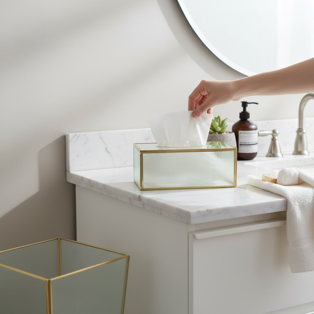 طقم سلة نفايات مع علبة مناديل زجاج ذهبي